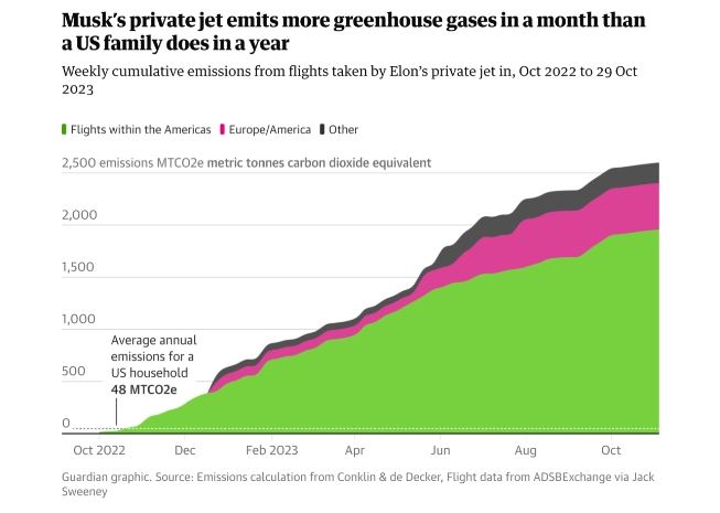 这些飞行的排放量使美国普通家庭每年不到50吨的排放量相形见绌。马斯克辩称,这架飞机有助于他延长工作时间,对于一个个人财富超过2300亿美元(接近希腊的GDP)的人来说,这是一种相对简朴的生活方式的“唯一例外”。尽管如此,马斯克的排放数字远低于精英阶层的其他人;该报告计算出,125名最富有的人通过投资交易平均每年排放300万吨地球供暖污染。