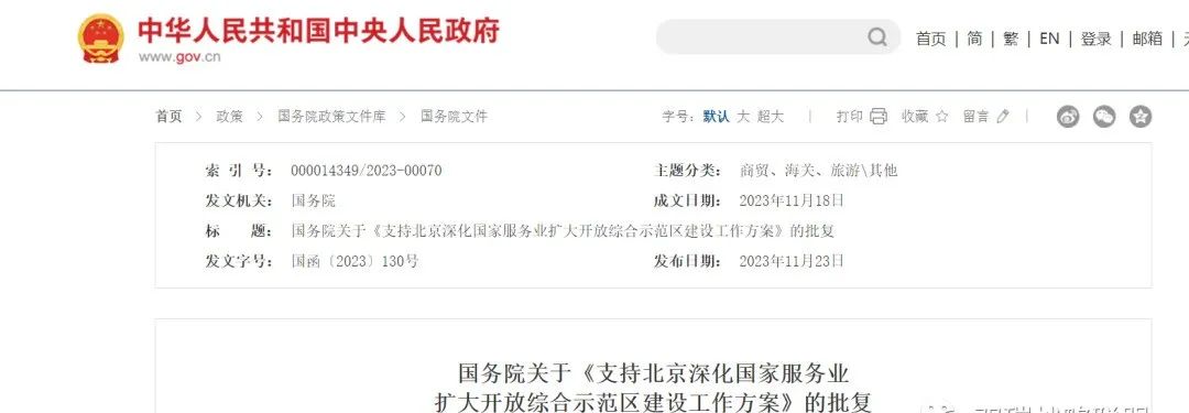 11月23日,国务院发布关于《支持北京深化国家服务业扩大开放综合示范区建设工作方案》的批复。