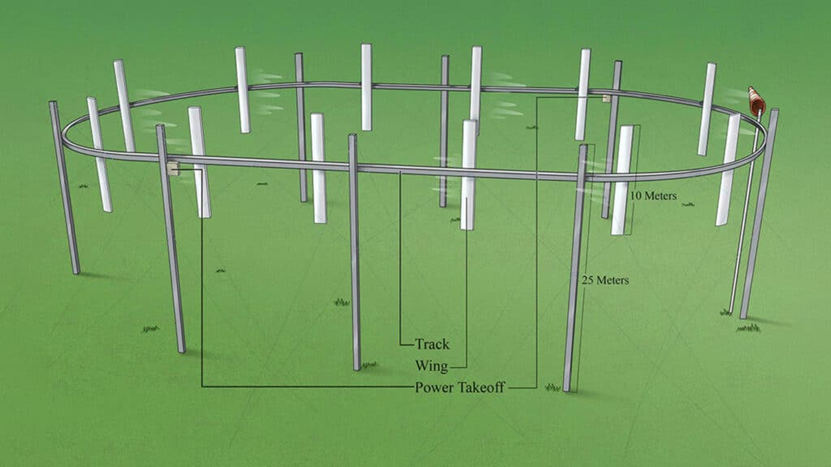 而 Airloom 的2.5兆瓦设备则不同,它只需使用一些25米(82英尺)高的电线杆来悬挂一个轻质的椭圆形轨道,在轨道上垂直安装10米(33英尺)长的叶片。风吹来时,叶片绕着轨道飞行并发电,有点像旋转木马。