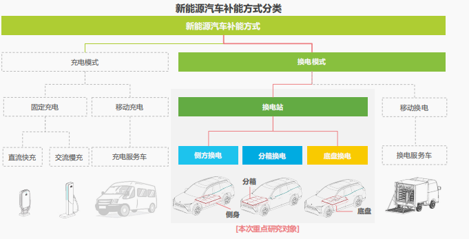 新能源汽车换电模式概念:指通过集中型充电站对大量电池集中存储、充电、统一配送,并在换电站内对电动汽车进行电池更换服务。
