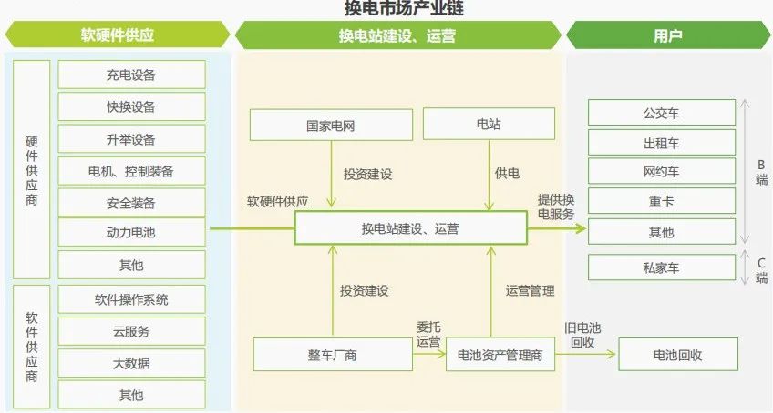 换电产业链由上游换电建设,中游换电运营,下游终端消费组成。换电行业产业链上游由电池供应商、换电站基础组件供应商、配套充电系统供应商组成,分别负责提供对应应用范围的动力电池和换电站设备、软件系统等,经过多次技术迭代,大部分厂商已经可以提供成套换电站设备。中游主要为整车制造商、运营商和电池银行,整车制造商和运营商负责换电站的搭建和运营,面向市场提供换电服务,电池银行对电池进行集中管理与租赁,构建了电池银行生态圈,很好地实现了消费者、新能源车企、电池银行的三赢。下游主要由换电服务用户和动力电池回收方组成,目前商用车、出租车等B端用户对换电模式需求更加强烈。