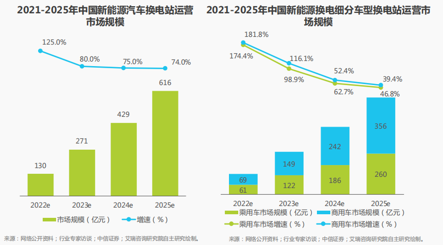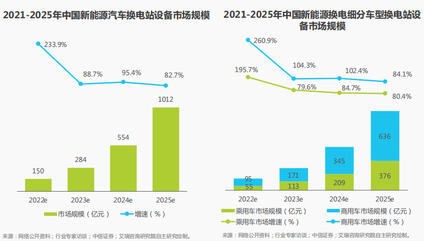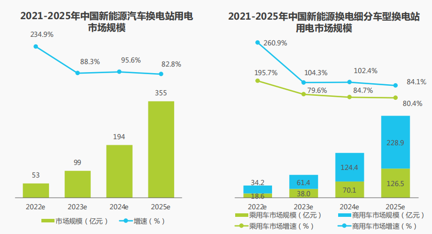 根据换电站需求量推算,到2025年换电站运营市场(售电等)规模将达1,448亿元,CAGR约87%,其中换电乘用车运营市场规模约260亿元,CAGR约85%,换电商用车运营市场规模约356亿元,CAGR约95% 。