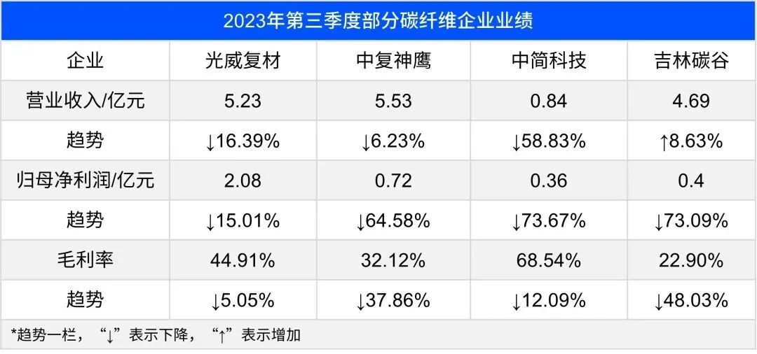 此外,受到价格影响,国内头部碳纤维企业业绩也受不同程度影响,毛利率均出现下滑。