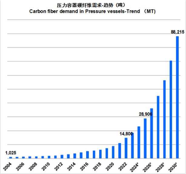 去年,中国气瓶碳纤维用量约0.6万吨,其中储氢瓶占比接近一半,未来压力容器用碳纤维的增长点也将出现在储氢瓶市场。