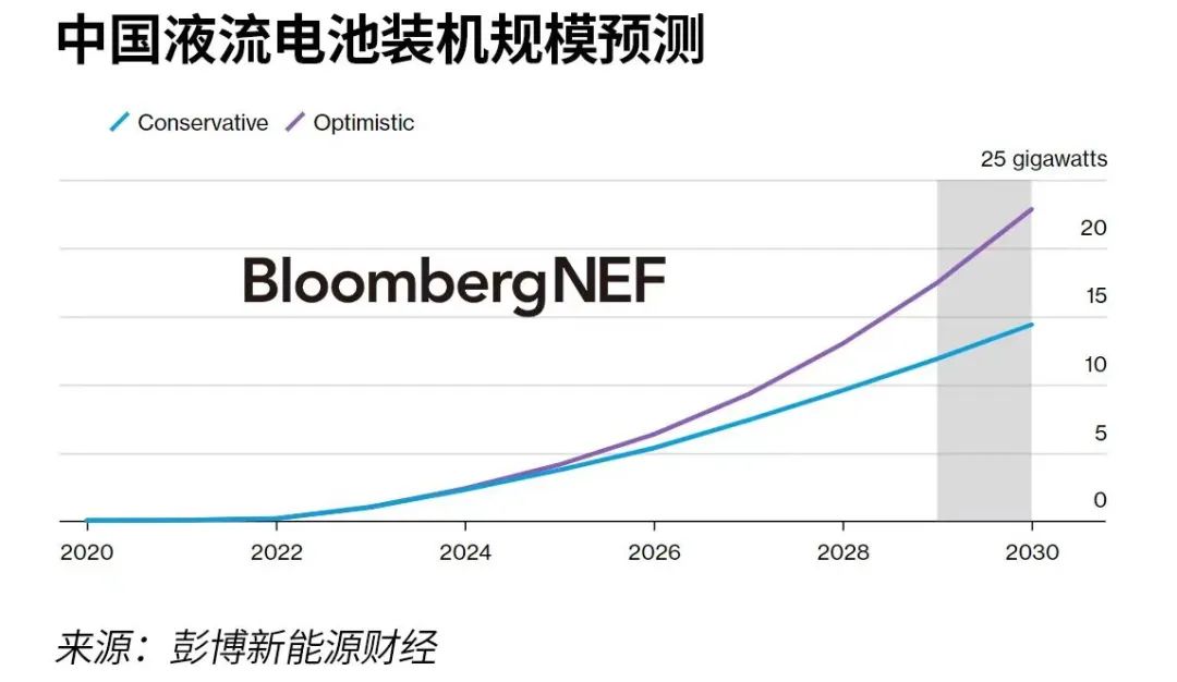 根据彭博新能源财经的预测,中国液流电池产业正处于迈向快速增长的关键期,到2030年中国的液流电池装机规模可能会达到14-23GW。