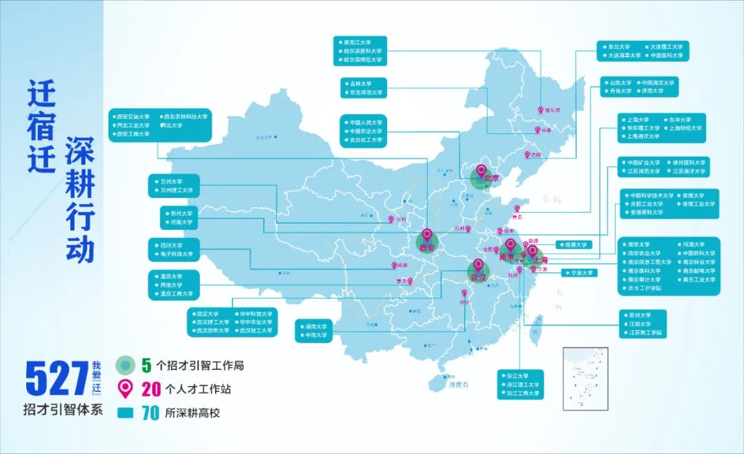 据介绍,“572”中的“5”,指的是北京、上海、西安、武汉、南京5个招才引智工作局;“2”,即在20个重点城市建立的20个人才工作站,“7”,即深耕70所高校。