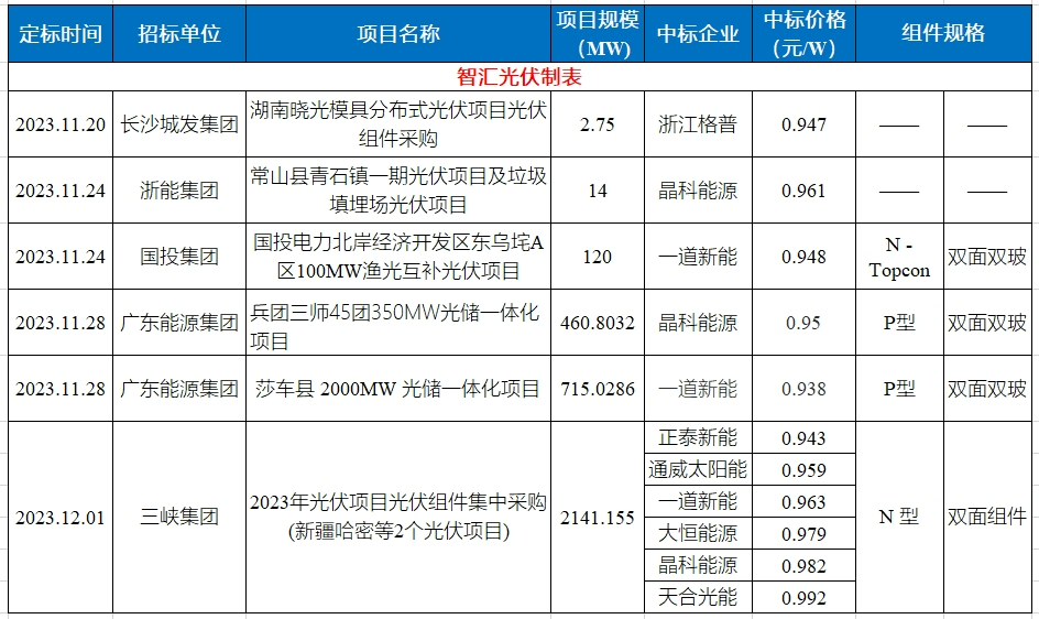 然而,实际上,近期中标的大量光伏组件,价格已经跌破1元/W,具体如下表所示。