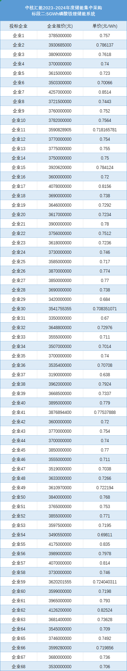 该标段共吸引了68家企业投标,最低报价为0.638元/Wh,最高报价为0.8514元/Wh。具体如下表所示。