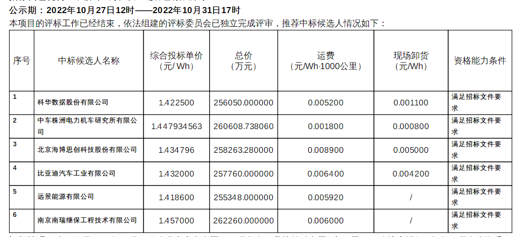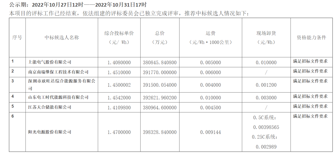 2022年10月27日,(标段二、标段三)的中标结果正式对外发布,中标价格区间为1.41~1.45元/Wh,具体如下表所示。