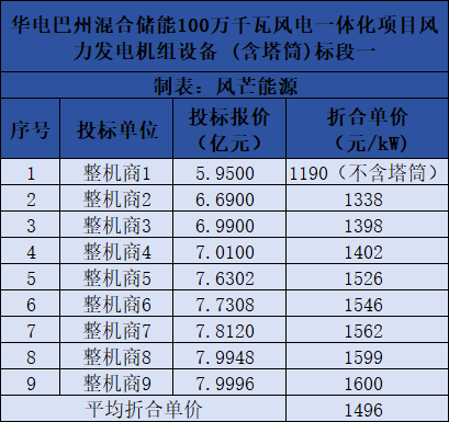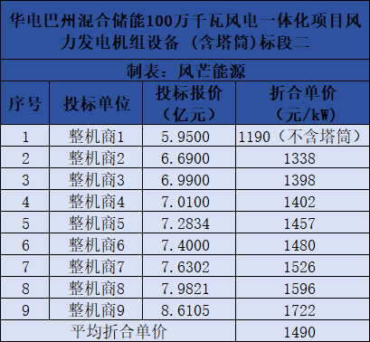 根据风芒能源的报道,2023年11月20日,华电巴州混合储能100万千瓦风电一体化项目风力发电机组设备 (含塔筒)、“全国一体化算力网络”和林格尔数据中心集群绿色能源供给示范项目风力发电机组采购开标。项目分两个标段,容量均为500MW。标段一、标段二均有9家整机商竞标
