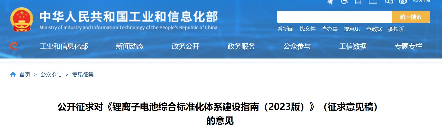 12月6日,工信部发布公开征求对《锂离子电池综合标准化体系建设指南(2023版)》(征求意见稿)的意见(以下简称《指南》)。