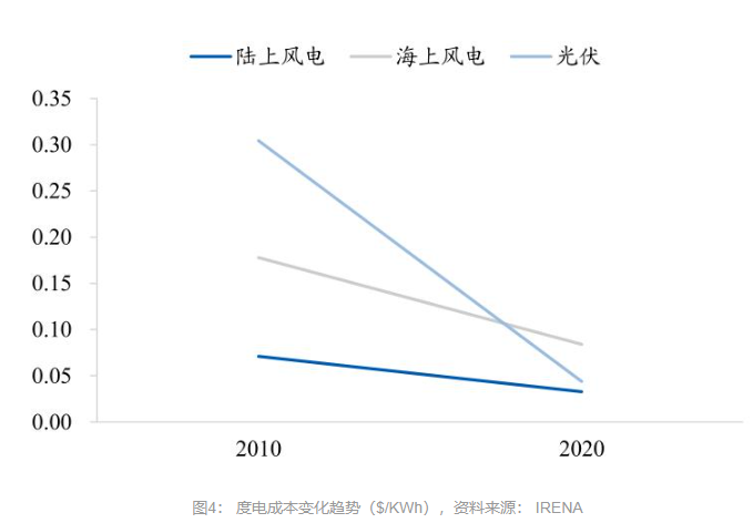 在新能源发电中,风电装机量一直领先于太阳能发电。2022年,两者位置互换,中国太阳能发电装机量首次超过了风电。这其中的核心逻辑就是光伏随着技术进步,成本下降更快,在用电成本上已经达到和风电相同的水平。如下图所示,海上风电尤其是远海风电,用电成本已经高于光伏,在成本更高且用电灵活性又不及光伏的情况下,远海风电很容易遇到瓶颈。