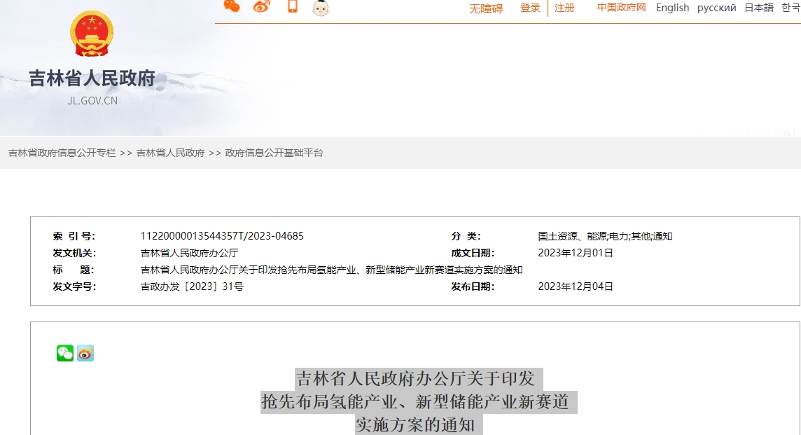 日前,吉林省人民政府办公厅印发《抢先布局氢能产业、新型储能产业新赛道实施方案》的通知。