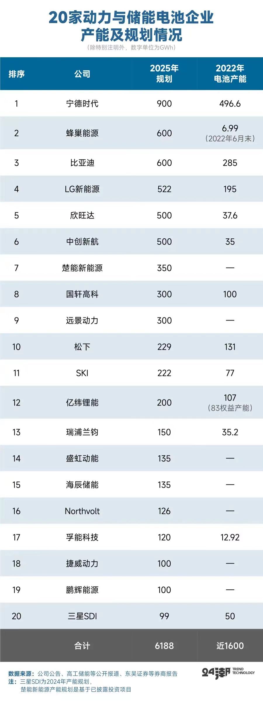 若考虑全球范围内其他产业巨头的发展规划,2025年全球动力与储能电池企业产能规划很可能将超过8000GWh。