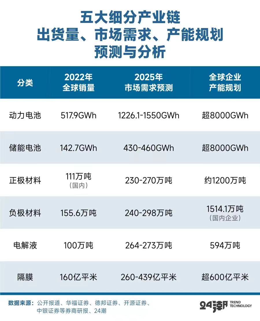 首先看24潮产业研究院(TTIR)统计的一组数据:截止目前,在动力电池、储能电池、正极材料、负极材料、电解液与锂电隔膜这6大核心赛道上,已知的企业产能规划均远超2025年第三方研究机构对市场需求的预测上限,未来三年内出现严重产能过剩似乎已经不可避免。