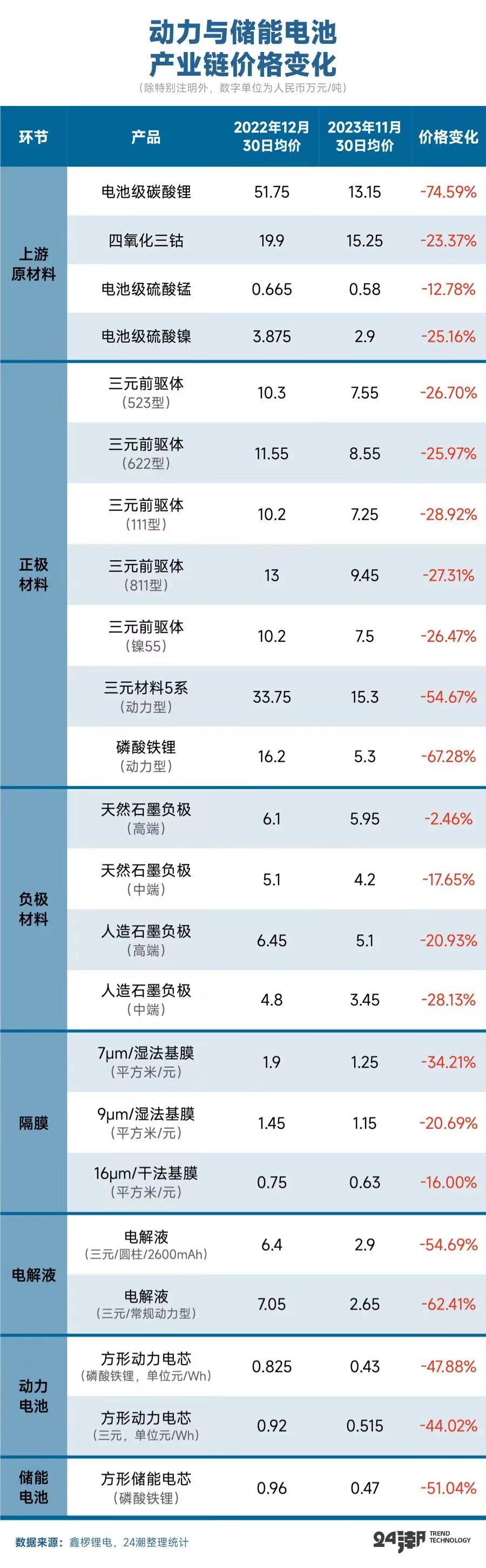 据24潮团队及鑫椤锂电整理统计,2023年前11个月,动力与储能电池核心产业链价格全线暴跌,其中动力电池跌幅超44%,方形储能电芯(磷酸铁锂)降幅超51%,另外部分正极材料与电解液产品价格降幅超60%,电池级碳酸锂价格跌幅更是超过74%。