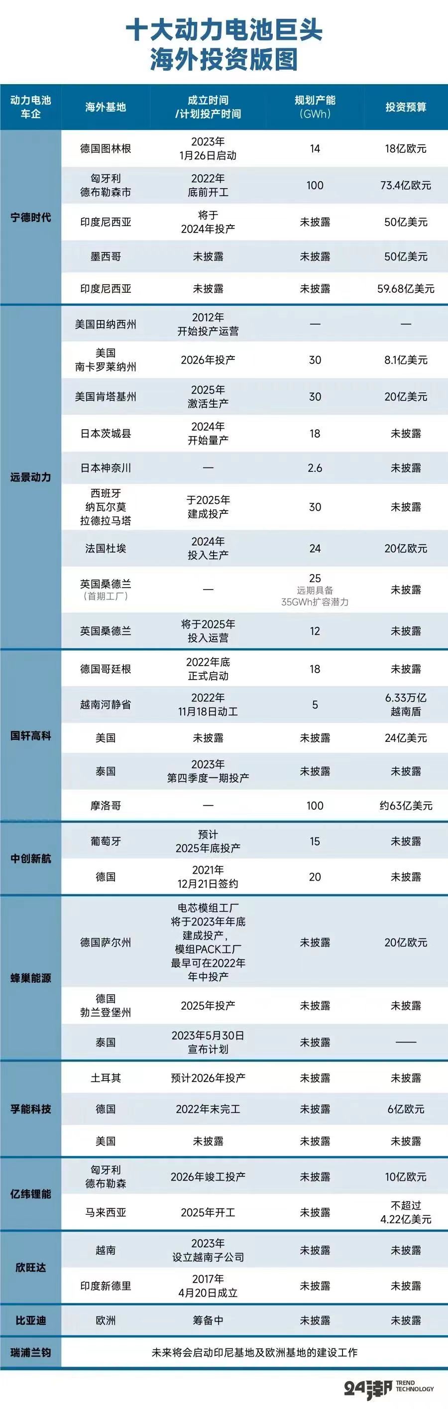 目前国内很多动力与储能电池巨头都在加速海外产能布局。据24潮团队不完全统计,截至目前,国内已有宁德时代、远景动力、国轩高科、中创新航、蜂巢能源、孚能科技、亿纬锂能、欣旺达等10家动力电池巨头计划或者已在海外有深度的产业布局,其公开对外披露的/媒体公开报道的项目达33个,总投资预算超4000亿元。