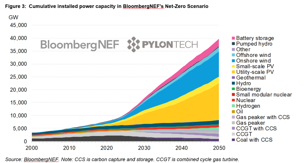 彭博新能源财经使用太阳能、风能和储能模拟了一条在2050年前全球实现净零排放的途径,这需要全球在2030年前安装722GW电池储能,在2050年前安装2.8TW电池储能。