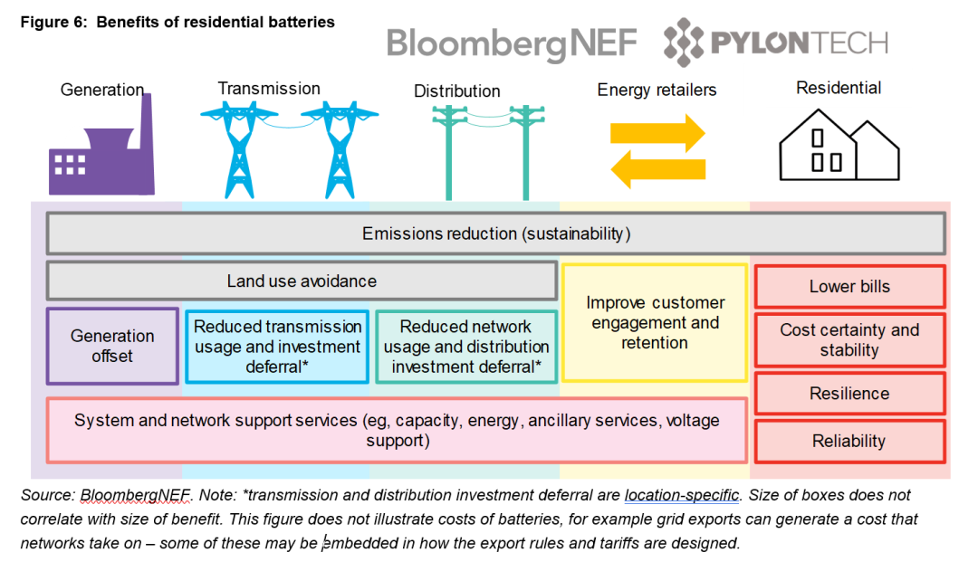 对家庭来说,户用储能可以节省用电成本,获得绿色的、自主调控的能源。在光伏渗透率高的地区,户储电池白天将太阳能存储起来,日落后释放出来,使用过程本身可平滑电力负荷曲线,减轻电网在高峰时期的压力;户用储能聚合后可以参与本地灵活性市场甚至是系统级的电网服务。