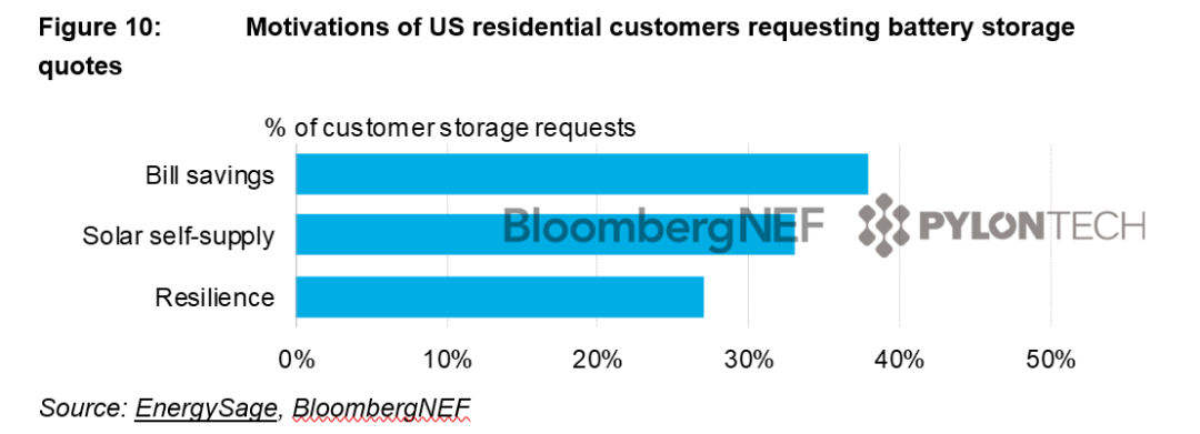 终端用户选择安装储能,可能来源于不同的驱动因素。超过三分之一的用户出于经济原因安装电池,减少用电费用;三分之一的用户希望提升太阳能自给自足水平,让电力消费更环保;另有百分之二十以上的用户希望获得备用电源,提升用电稳定性。