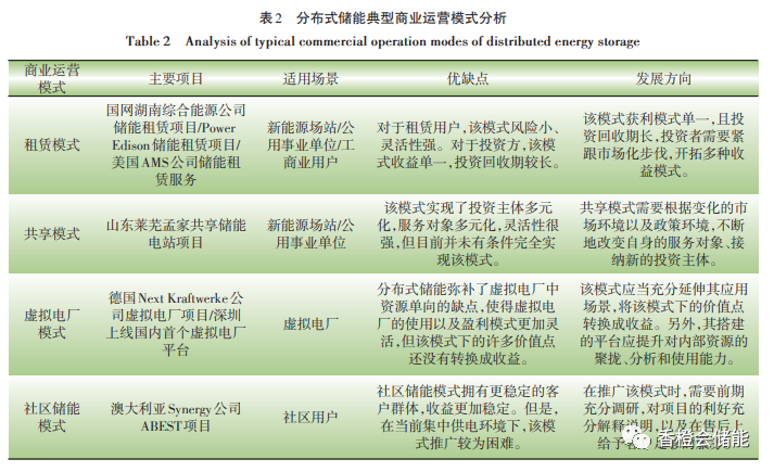 基于国内的政策环境以及国内外相关项目的实践经验,本章对分布式储能目前较为成熟的租赁模式、共享模式、虚拟电厂模式以及社区储能模式进行探讨总结。4种典型商业模式的总结如表2所示。