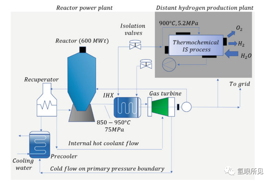 两者的主要区别在于,高温电解槽必须与热源和电源相结合。核电厂,尤其是第四代核电厂,可以提供电力,而且在 VHTR(超高温反应堆) 的情况下,还可以提供相对较高的温度和较高的净功率循环效率。超高温反应堆核电制氢示意如下图2: