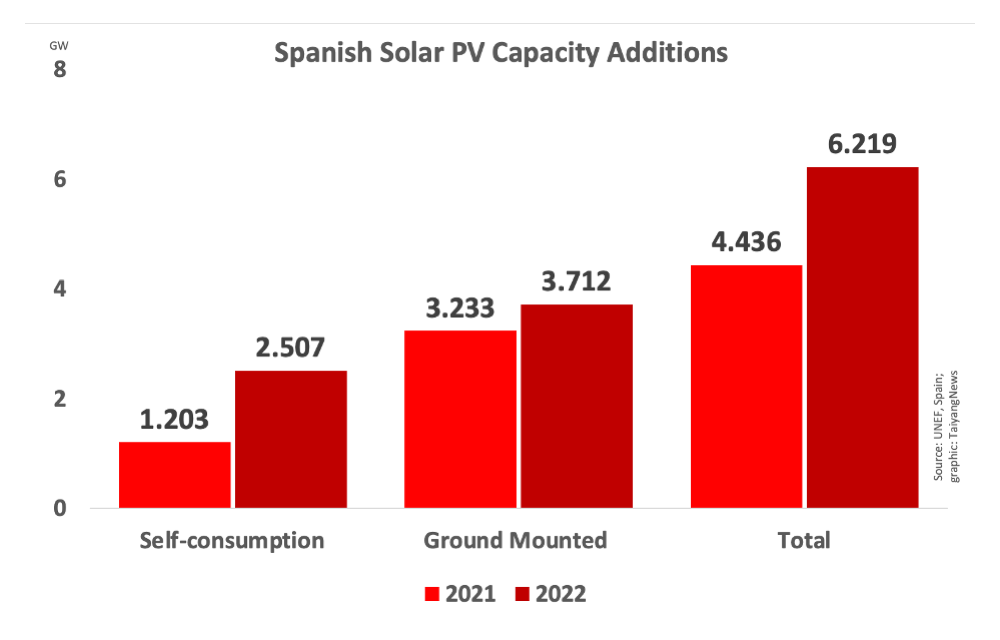 2022年西班牙太阳能光伏累计装机量已达22GW,年度新增总光伏装机量6.2GW:其中近3.7GW为大型地面电站,2.5GW为自发自用式。