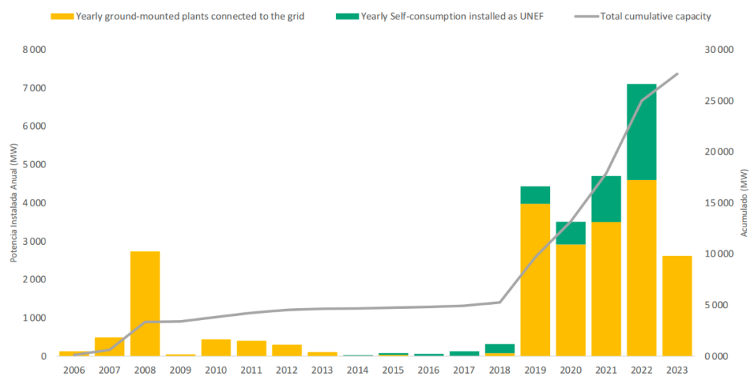 太阳能光伏发电是西班牙近年来增长最快的可再生能源,2019年至2022年增长了129%,在2022年底达到22GW,这表明未来八年(2023-2030)的目标是新增光伏装机54GW。