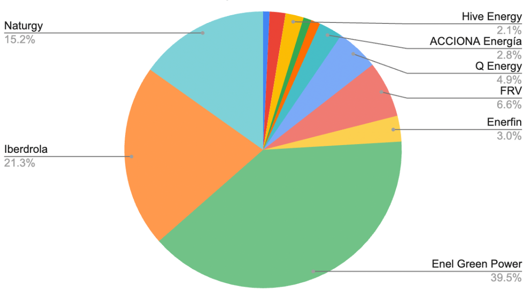 隶属于Endesa集团的可再生能源公司Enel Green Power是该项目中获得补助最多的公司,占比39.5%共计62452477.14 欧元,该资金将涉及6个全部位于西班牙Extremadura地区的项目;占比21.3%排名第二的属于另一家西班牙电气公司Iberdrola,共获得33731252.75 欧元的补贴;占比15.2%排名第三的为西班牙天然气公司Naturgy 获得共计 2398280.66 欧元的资金,该笔补贴将分配给7个混合储能项目。