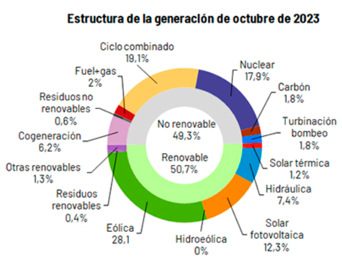 除去气温和工作日程的影响,今年10月份西班牙全国电力需求同比增长 1.3%,在该月度中,可再生能源发电量占总发电量的50.7%,10月可再生能源的发电量为10.609 GW,与2022年10月相比增长了25.5%。据西班牙电力公司Red Eléctrica最新数据,11月22日西班牙可再生能源发电量占总发电量的69%。