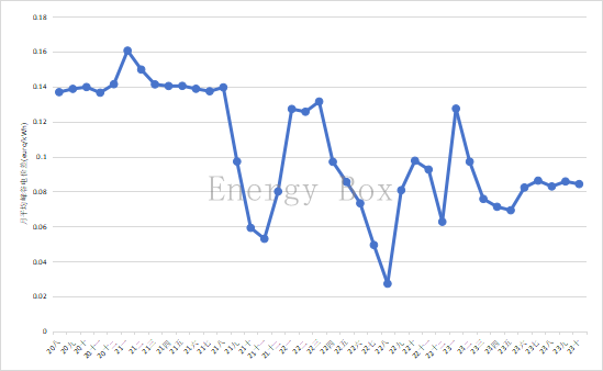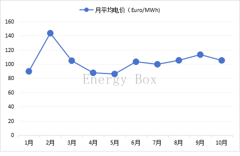 截至2023年10月,本年2月平均电价最高为143.42欧元/MWh(1.12元/kWh),5月平均电价目前最低为85.99欧元/MWh(0.67元/kWh), 10月平均电价为105.11欧元/MWh(0.82元/kWh)。