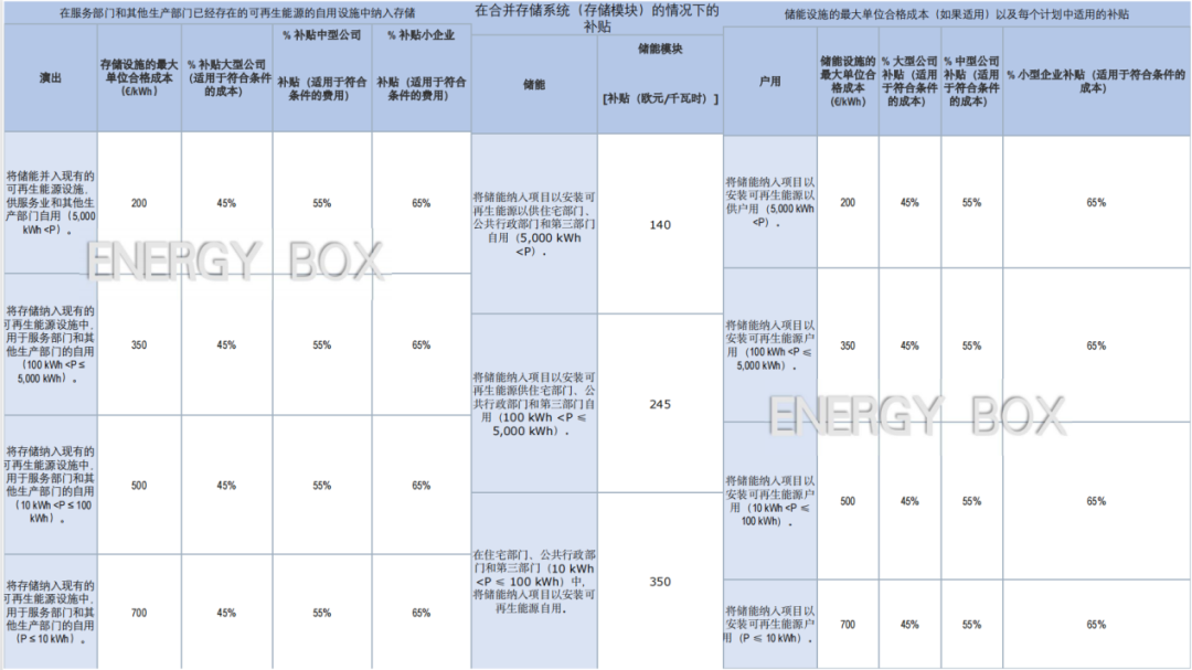 ---2023年7月,西班牙政府将为独立储能项目提供 1.5 亿欧元的补助,为混合储能项目提供 1.5 亿欧元的补助,以及为热能储存项目提供 3,000 万欧元的补助。