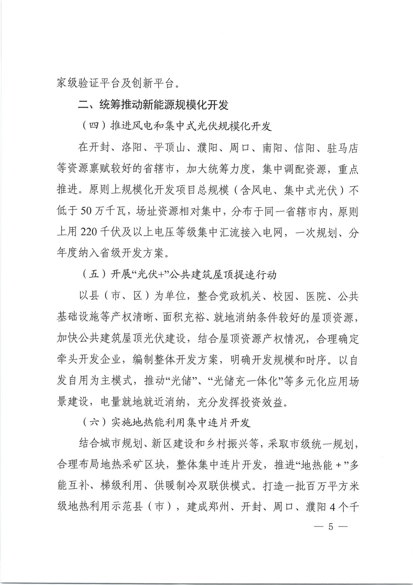 《征求意见》还指出,推进风电和集中式光伏规模化开发。在开封、洛阳、平顶山、濮阳、周口、南阳、信阳、驻马店等资源禀赋较好的省辖市,加大统筹力度,集中调配资源,重点推进。原则上规模化开发项目总规模(含风电、集中式光伏)不低于50万千瓦,场址资源相对集中,分布于同一省辖市内,原则上用220千伏及以上电压等级集中汇流接入电网,一次规划、分年度纳入省级开发方案。