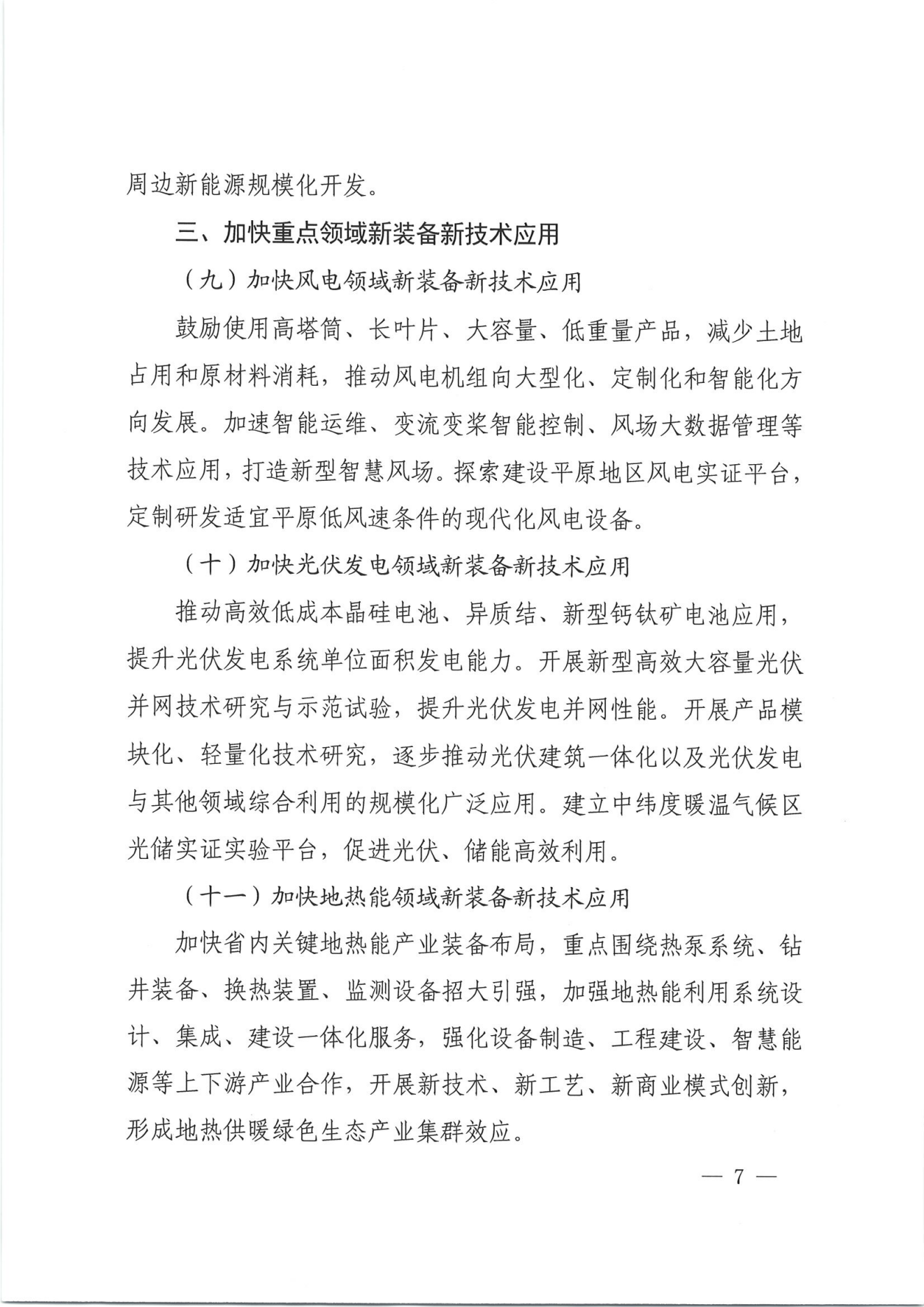 加快重点领域新装备新技术应用。加快风电领域新装备新技术应用,鼓励使用高塔筒、长叶片、大容量、低重量产品,减少土地占用和原材料消耗,推动风电机组向大型化、定制化和智能化方向发展。加速智能运维、变流变桨智能控制、风场大数据管理等技术应用,打造新型智慧风场。探索建设平原地区风电实证平台,定制研发适宜平原低风速条件的现代化风电设备。