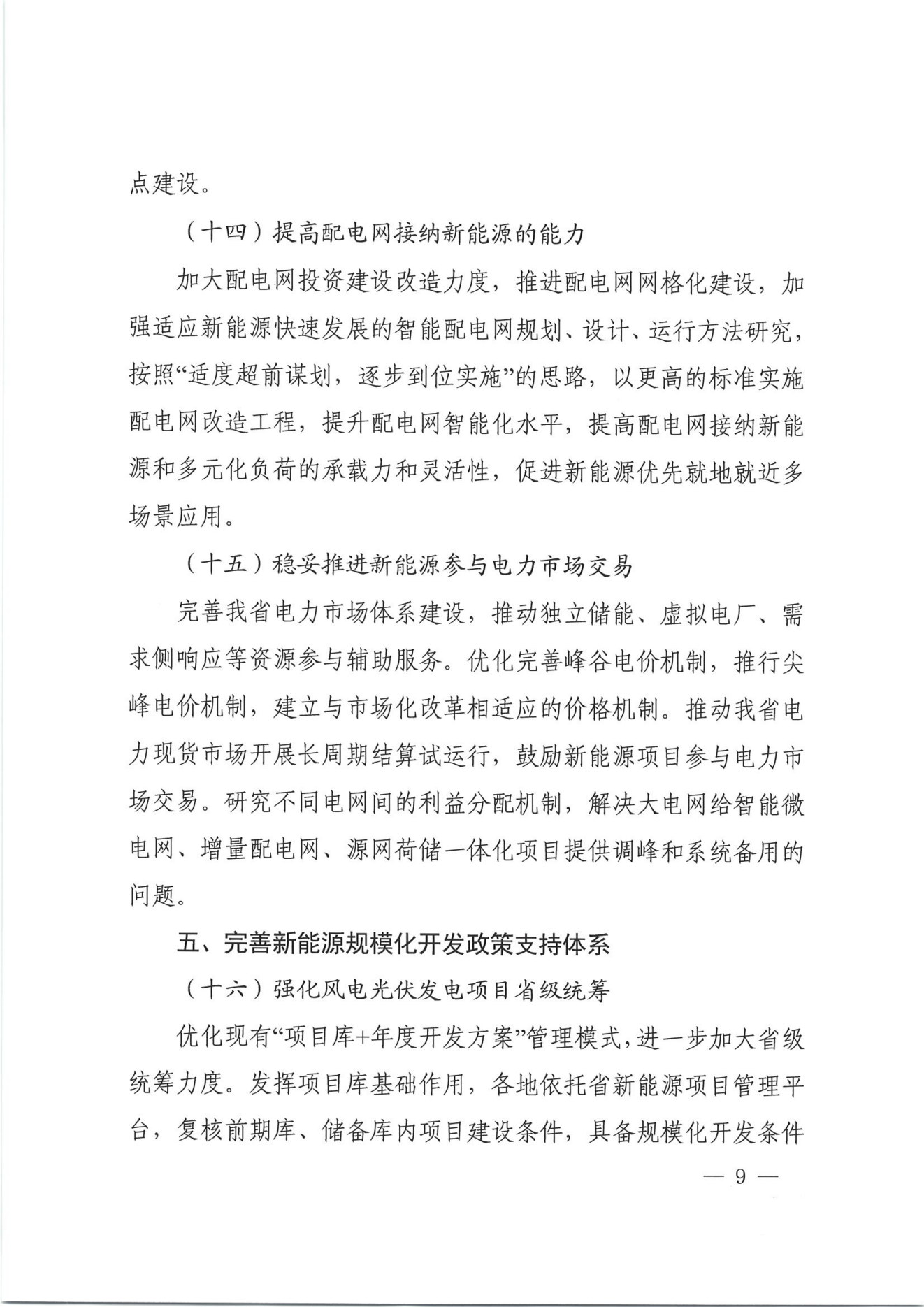 稳妥推进新能源参与电力市场交易。完善我省电力市场体系建设,推动独立储能、虚拟电厂、需求侧响应等资源参与辅助服务。优化完善峰谷电价机制,推行尖峰电价机制,建立与市场化改革相适应的价格机制。推动我省电力现货市场开展长周期结算试运行,鼓励新能源项目参与电力市场交易。