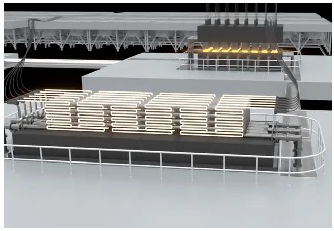 图说:加热元件为液态锡加载能量,并将能量储存在白热石墨块中