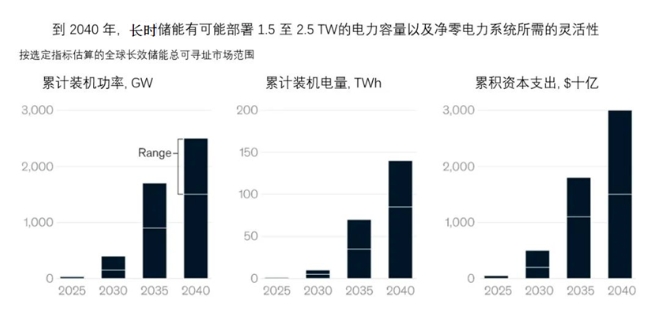 2021年,全球知名咨询公司麦肯锡和长期储能协会(LDES)发布的一份报告表示,到2040年,LDES 有可能在全球部署 1.5 至 2.5 TW)(太瓦)的装机容量,是当前部署的总储能容量的8到15倍。对应的储能容量是 85-140TWh)(太瓦时 )。