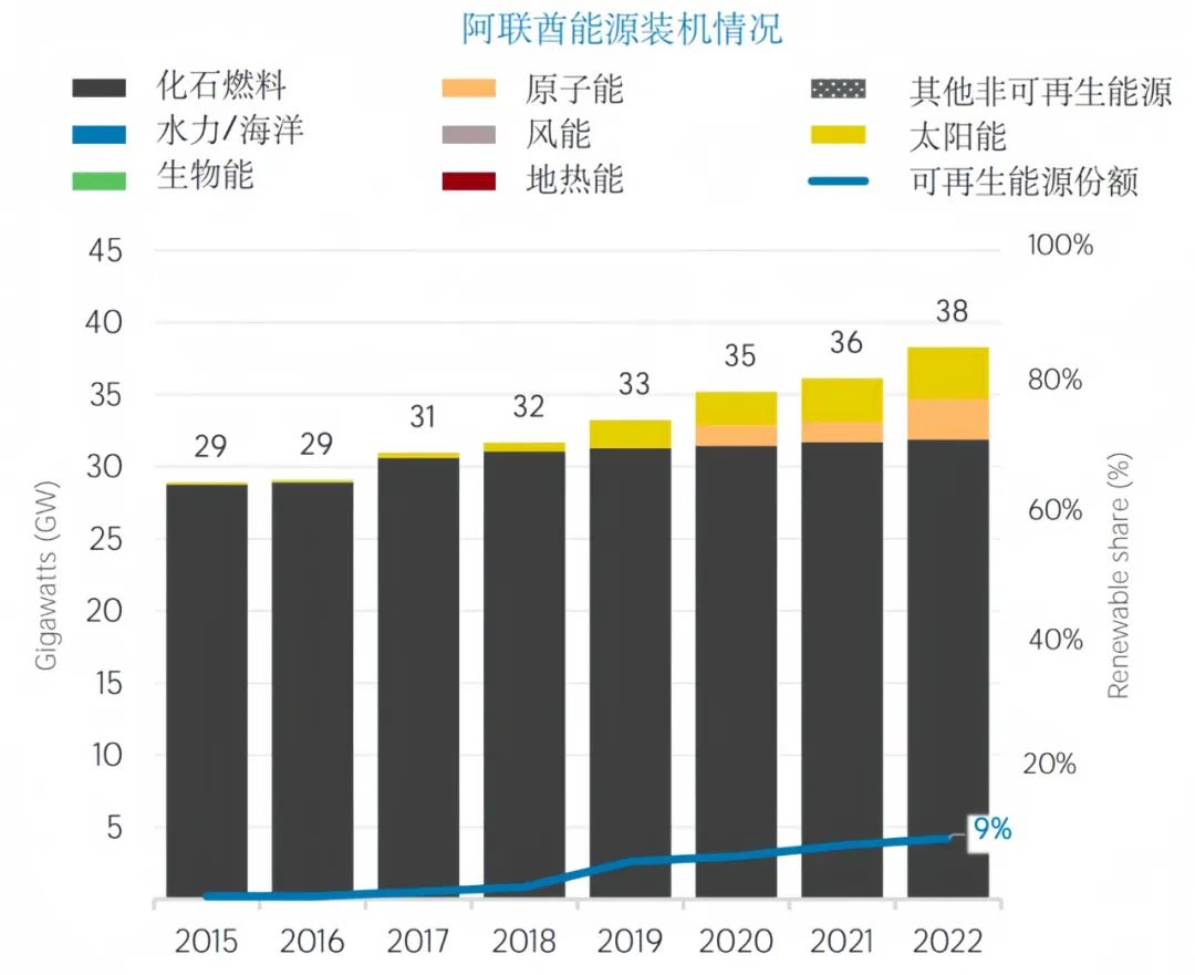 以阿联酋为例,阿联酋不同能源的装机量如图,化石燃料仍占据重要组成。