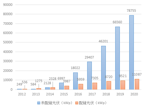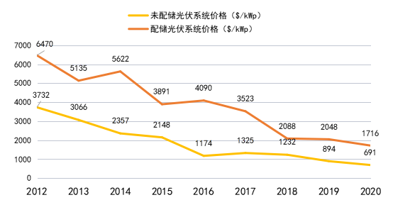 以黎巴嫩为例,其光伏配储率随着其光储系统价格的下降而不断上升,2020年黎巴嫩的光伏配储率达到了12%,共有11,087kWp光伏配备了储能系统。