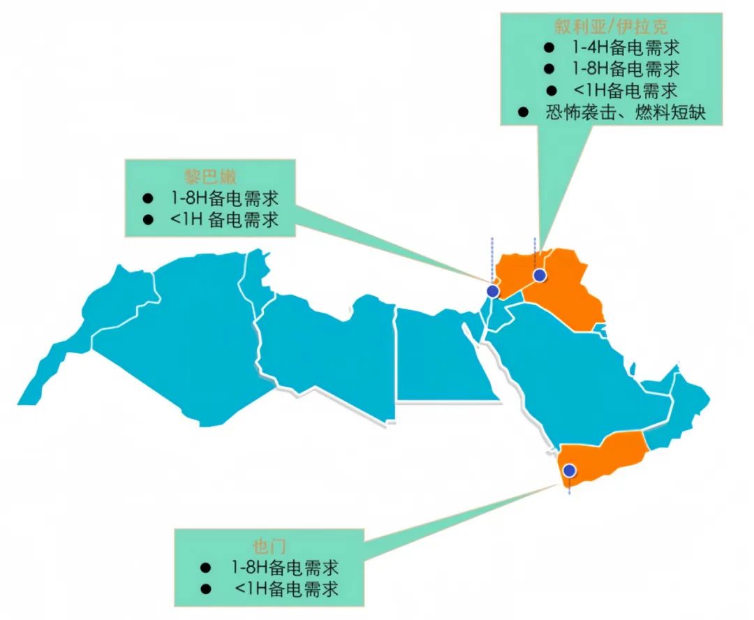 由于地缘政治风险等因素,用户侧储能需求集中体现在黎巴嫩、也门、叙利亚和伊拉克等地区,这些需求集中体现在对于小于1h的备电需求,以及1h-4h或者1h-8h的直接电力供给需求。