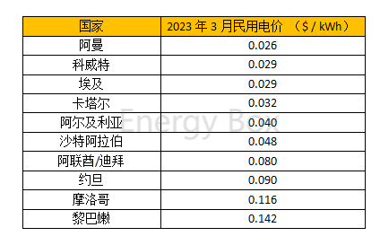 一、2023年3月中东北非部分国家民用电价:(由低到高排列)