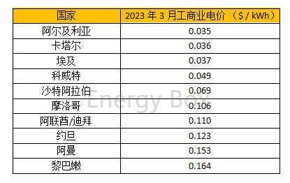 二、2023年3月中东北非部分国家工商业电价:(由低到高排列)