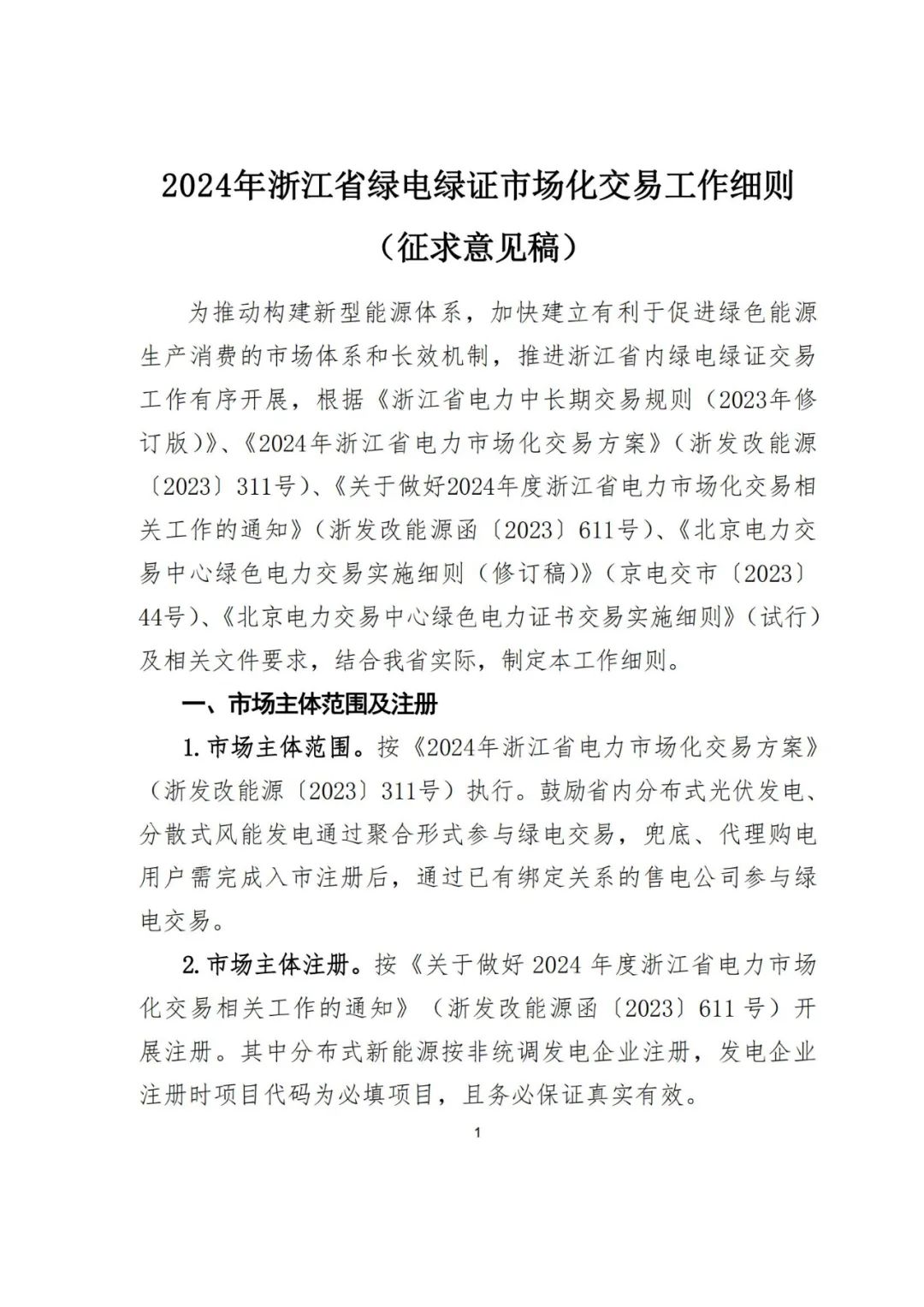 近日,浙江电力交易中心发布了关于公开征求《2024年浙江省绿电绿证市场化交易工作细则(征求意见稿)》意见的通知。根据文件: