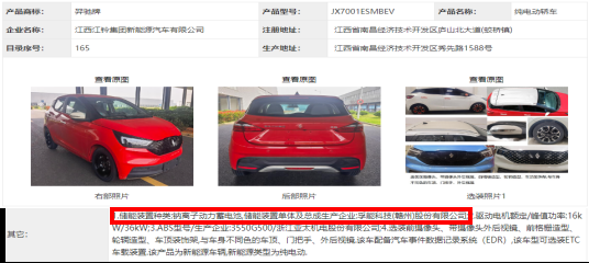 根据今年6月的工信部372批公告,江铃汽车与孚能科技共同合作的车型商标为羿驰牌(EV3),该车为纯电动轿车,总质量1380kg,最高车速100km。