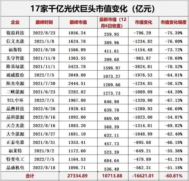 至12月6日收盘,曾经的17家光伏千亿市值巨头市值合计较巅峰时刻减少2.08万亿元,降幅达63.04%。