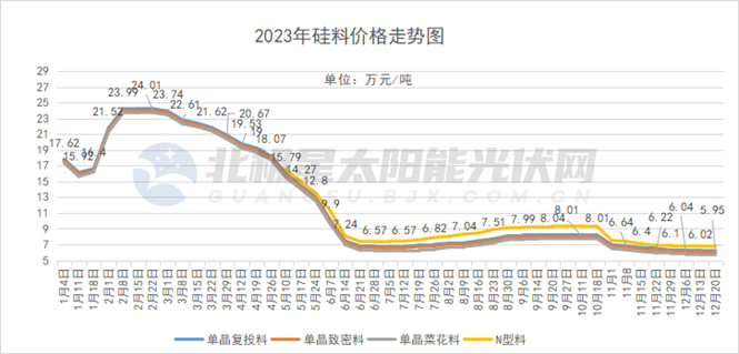 但从2022年11月开始,硅料价格下跌,到今年6月,跌幅近80%,直到今年年底,一直徘徊在60元/kg附近。市场从原来的拥硅为王到谈硅色变。