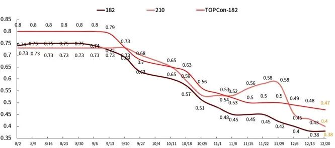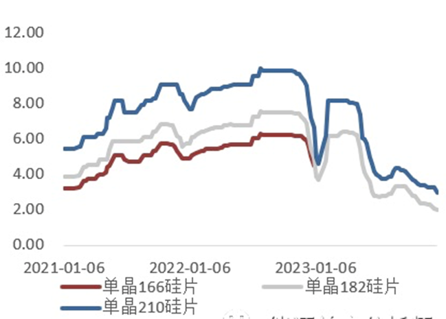 此外,同为上游的硅片也紧密跟随着硅料的价格走势。12月26日,隆基绿能宣布再次下调硅片价格,M10硅片150μm厚度(182/247mm)价格为2.2元/片,较9月降幅达29%。
