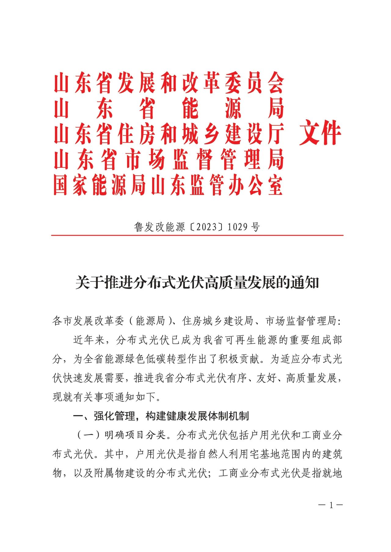12月27日,山东省发展和改革委员会、山东省能源局、山东省住房和城乡建设厅、山东省市场监督管理局和国家能源局山东监管办公室联合发布《关于推进分布式光伏高质量发展的通知》,其中提到: