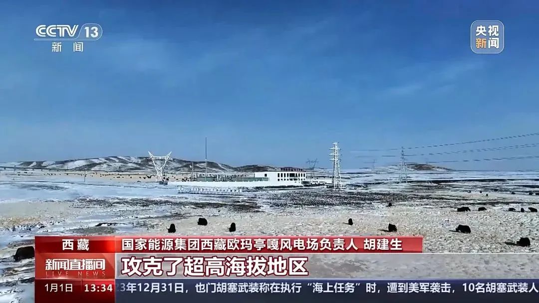 记者:我现在就在西藏那曲欧玛亭嘎风电场,这里的海拔有4800米。这个风电场有25台单机容量4.0兆瓦的风机,是目前我国超高海拔地区单机容量最大的风电机组。这里产生的电能主要输送到那曲地区,全容量投产后,能够满足当地23万人一年的用电量。