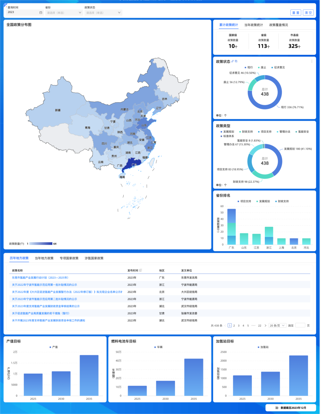 截至2023年12月25日,【氢界】合计收录地方政府发布的氢能政策438项。涵盖发展规划、财政支持、项目支持等多个领域,为氢能产业的发展提供了有力的政策保障。